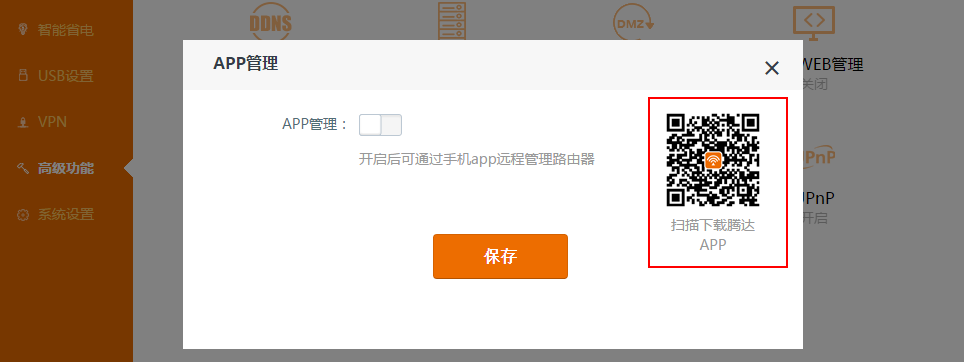 首先你的路由器包装包括路由器产品机身都可能会贴有一个APP的下载二维码。 以腾达或TPlink为例。 腾达的APP二维码下载在产品包装盒上就有