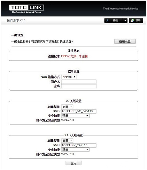 在开通宽带的时候,宽带运营商提供了 宽带账号、宽带密码给你,并且在未使用路由器上网时,电脑上需要用“宽带连接”(或者类似的拨号程序),填写宽带账号、密码进行拨号上网。那么在设置TOTOLINK路由器上网时,“连接方式”就应该选择:PPPoE——>“用户名”填写:宽带账号——>“密码”填写:宽带密码。
