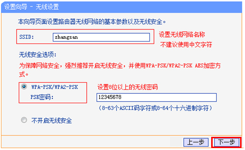 8、配置无线网络:“SSID”即无线网络名称,用户根据自己的需求进行设置——>勾选“ WPA-PSK/WPA2-PSK”——>设置“PSK密码”——>点击“下一步”。