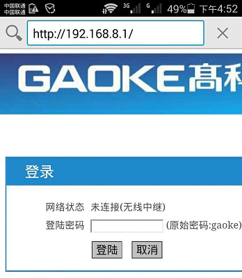 在手机浏览器地址栏中输入:192.168.8.1——>在“登陆密码”中输入:gaoke——>点击“登陆”,如下
