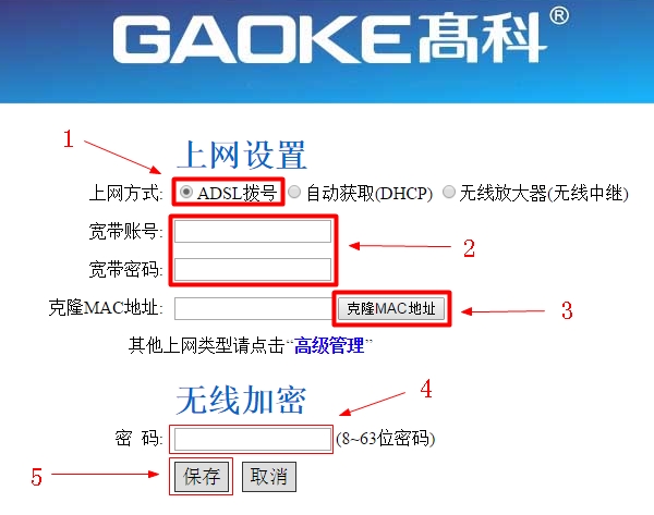 “上网方式”选择:ADSL拨号——>填写宽带运营商(网络管理员)提供的“宽带账号”、“宽带密码”——>点击“克隆MAC地址”——>设置无线密码——>点击“保存”。