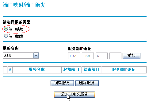 2、此页面默认已选择了“端口映射”,在“服务名称”中列出了一些常用的服务,但下面我们以建立一个此列表中没有的服务为例。点击页面下方的”添加自定义服务”:
