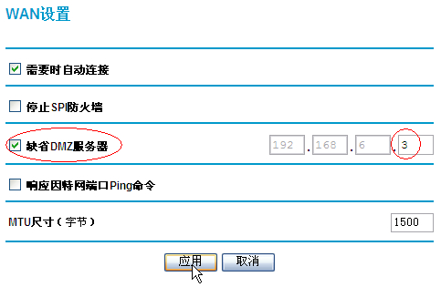 9、在WAN设置页面中的“缺省DMZ服务器”前打勾,然后将欲作为DMZ主机的电脑的IP地址填入,所以电脑的IP地址须是固定(手工设置)的,而不是自动获得: