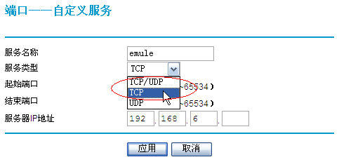 3、以eMule为例。当在局域网中使用eMule时,通常只能获得LowID,通过端口映射后即可获得HighID了。在“服务名称”中添加您为此服务的命名,此处我们将其命名为eMule,“服务类型”选择TCP(或者TCP/UDP):