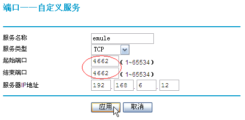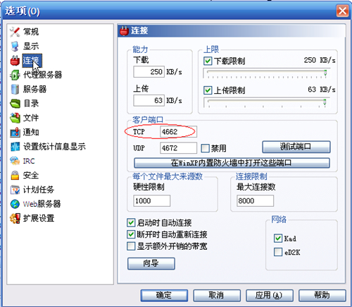 4、“起始端口”和“结束端口”都设置为eMule所使用的端口,如在eMule-0.46c-VeryCD0913中,默认使用的TCP端口是4662,此参数是在eMule的选项→连接→客户端口中定义的: